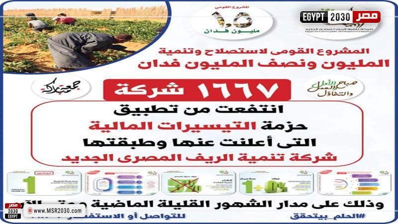 أعلنت شركة تنمية الريف المصرى الجديد، المسئولة عن تنفيذ وإدارة المشروع القومى لاستصلاح وتنمية المليون ونصف المليون فدان، أن ١٦٦٧ شركة، من بين الشركات المتعاقدة على أراضى المشروع القومى الـ ١.٥ مليون فدان، قد انتفعت من تطبيق حزمة التيسيرات المالية المتكاملة، التى أعلنت عنها وطبقتها شركة تنمية الريف المصرى الجديد على مدار الشهور الماضية وحتى الآن.