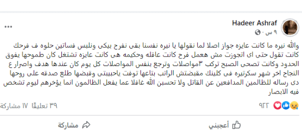 وكتبت هدير أشرف، عبر حسابها بموقع فيسبوك: " والله نيره ما كانت عايزة جواز أصلا، لما نقولها يا نيرة نفسنا بقى نفرح بيكى ونلبس فساتين حلوة في فرحك، كانت تقول حتى لو اتجوزت مش هعمل فرح كانت عاقلة وحكيمة".