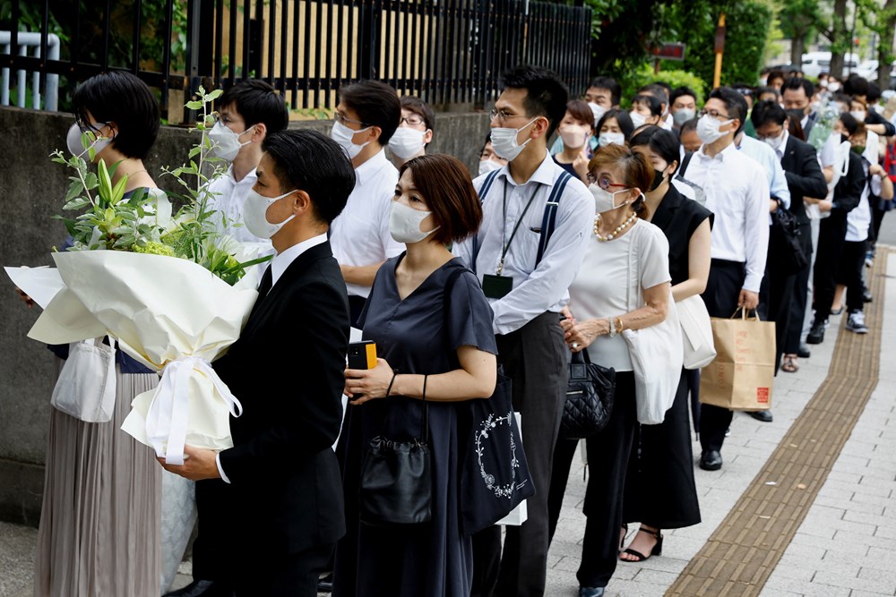 وذكرت صحيفة "جابان توداي" أن صفوفا طويلة من المواطنين، الذين يرتدون الملابس السوداء، وقد اختلطوا بآخرين في ملابس غير رسمية، تشكلت منذ الصباح خارج معبد زوجوج بوسط طوكيو، حيث أقيمت مراسم جنازة آبي.