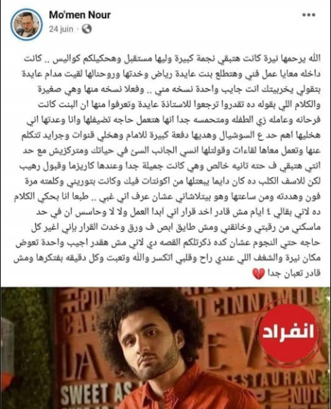 وكتب مؤمن نور، قبل حذف المنشور: "الله يرحمها نيرة كانت هتبقي نجمة كبيرة وليها مستقبل وهحكيلكم كواليس.. كانت داخلة معايا عمل فني وهتطلع بنت عايدة رياض وخدتها وروحنا لها لقيت مدام عايدة بتقولي يخرب بيتك أنت جايب واحدة نسخه مني".