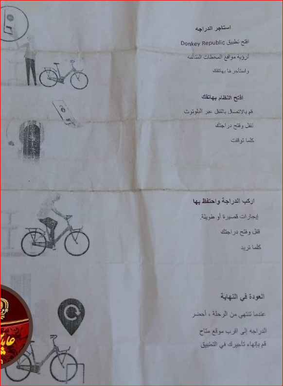 وبحسب ورقة إرشادات استئجار الدراجة الهواية بالمشروع فإنه يتعين على المستأجر تحميل تطبيق donkey republic لرؤية مواقع المحطات المتاحة، ثم الاتصال بالقفل عبر البلوتوث لقفل وفتح الدراجة كلما توقف في مكان ما.