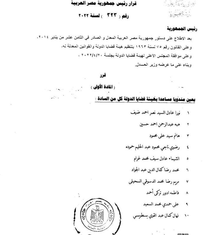 أصدر الرئيس عبد الفتاح السيسي رئيس جمهورية، القرارين رقم ( 322 ) و( 323 ) بتعيين 553 من خريجي كليات الحقوق والشريعة والقانون والشرطة دفعتي 2015 و 2016 مندوب مساعد (مستشار) بهيئة قضايا الدولة.