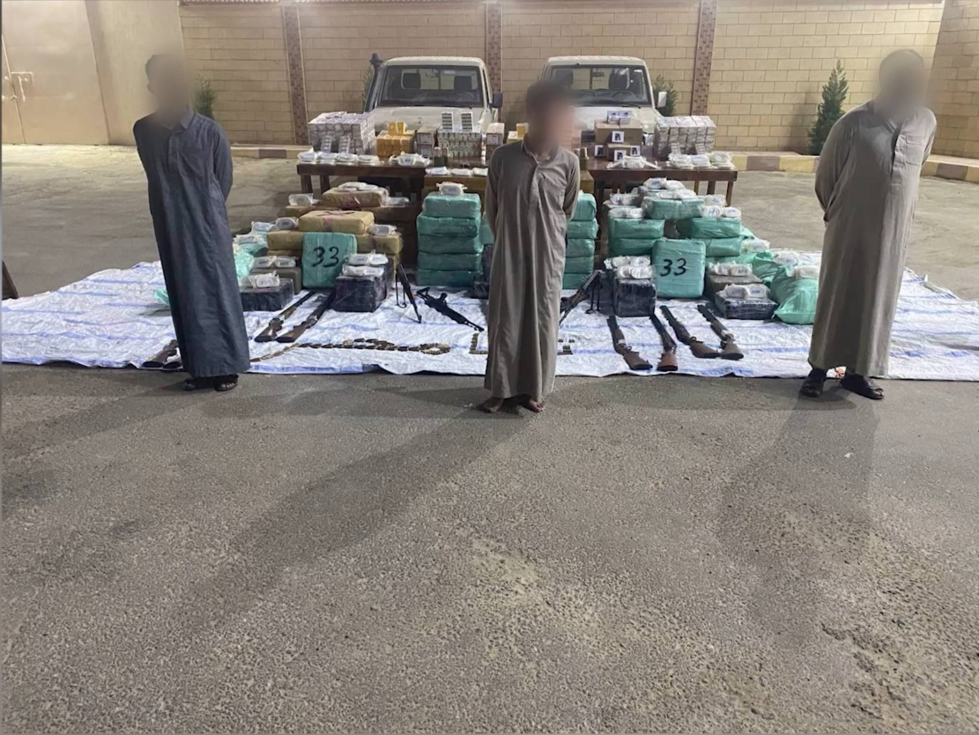 تمكنت قوات حرس الحدود من ضبط (2) عربة دفع رباعى يستقلهم عدد (3) مهربين مصريين الجنسية عثر بحوزتهم على (1800) كجم من مخدر الحشيش و(150) ألف قرص مخدر و(13) بندقية مختلفة الأنواع و(2800) طلقة مختلفة الأعيرة و(6) خزن أنواع ، كما تم ضبط (262) هاتف محمول مختلف الأنواع ، وطائرة بدون طيار.