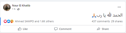واكتفت نور الخطيب، بالكتابة عبر حسابها الشخصي على موقع التواصل الاجتماعي "فيسبوك": "الحمد لله رب العالمين".