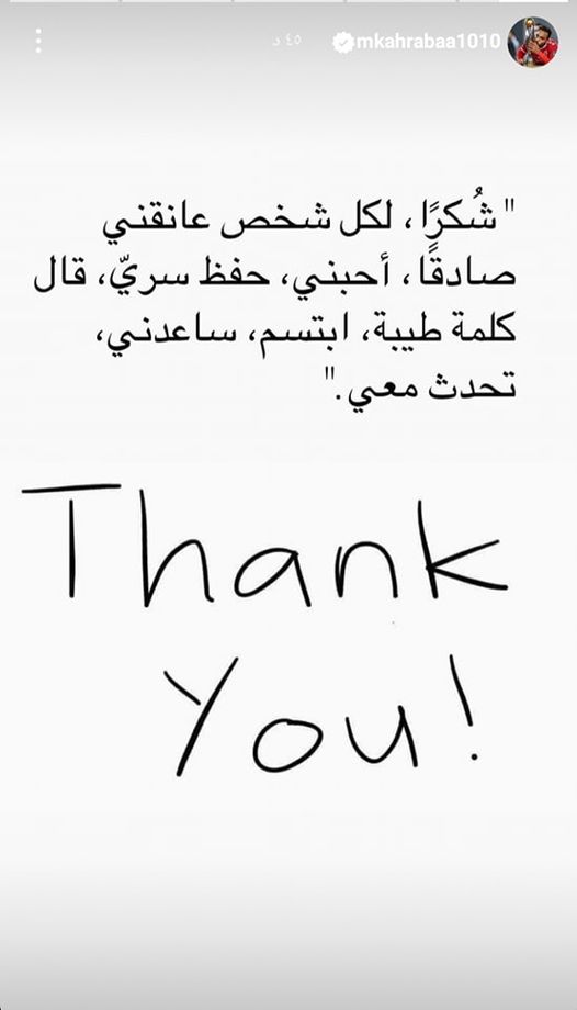 وكتب كهربا عبر حسابه الشخصي على موقع التواصل الاجتماعي انستجرام: "شكرًا، لكل شخص عانقني صادقًا، أحبني، حفظ سري، قال كلمة طيبة، ابتسم، ساعدني، تحدث معي".