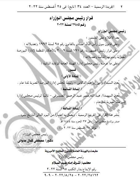 نشرت الجريدة الرسمية، قرار رئيس مجلس الوزراء، بتعيين رامي إبراهيم الدكاني، رئيسًا لمجلس إدارة البورصة المصرية لمدة عام، وتعيين هبة الله عمر عبد الرحمن الصيرفي، نائبًا لرئيس مجلس إدارة البورصة المصرية لمدة عام.