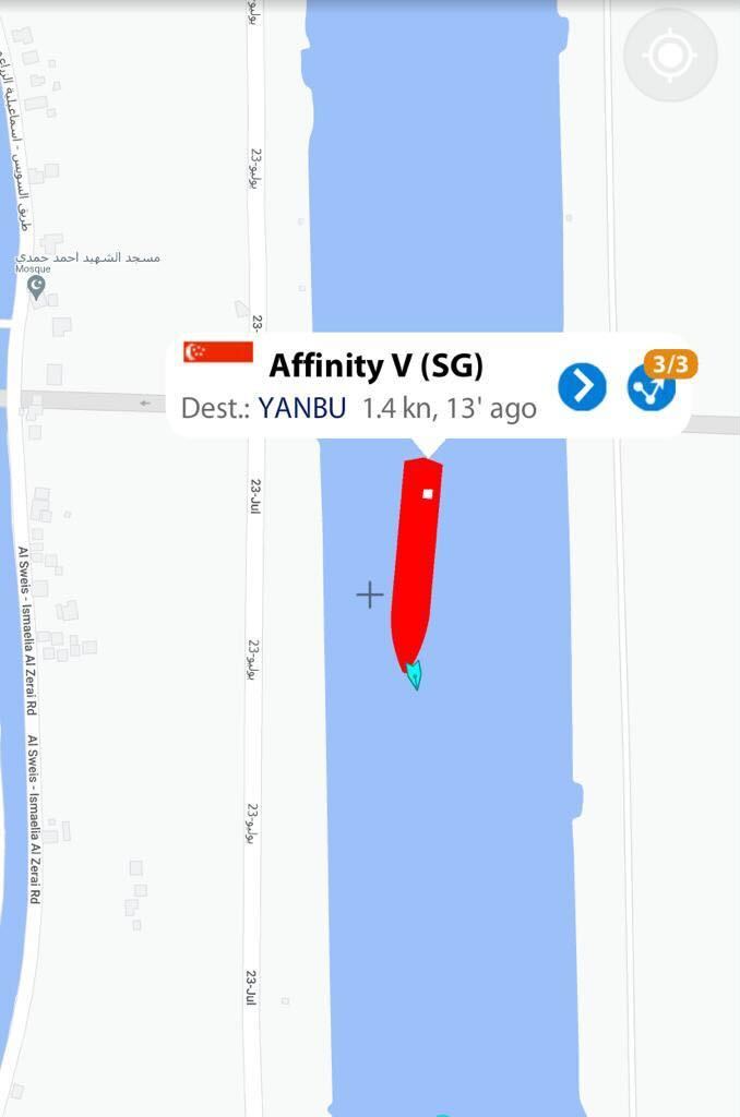 أعلنت هيئة قناة السويس، عن عودة حركة الملاحة لطبيعتها وذلك بعد أن جنحت السفينة "AFFINITY V" السنغافورية والمحملة بالنفط، المجرى الملاحي لقناة السويس بمصر، وكانت قادمة من البرتغال وفي طريقها إلى ميناء ينبع بالسعودية.