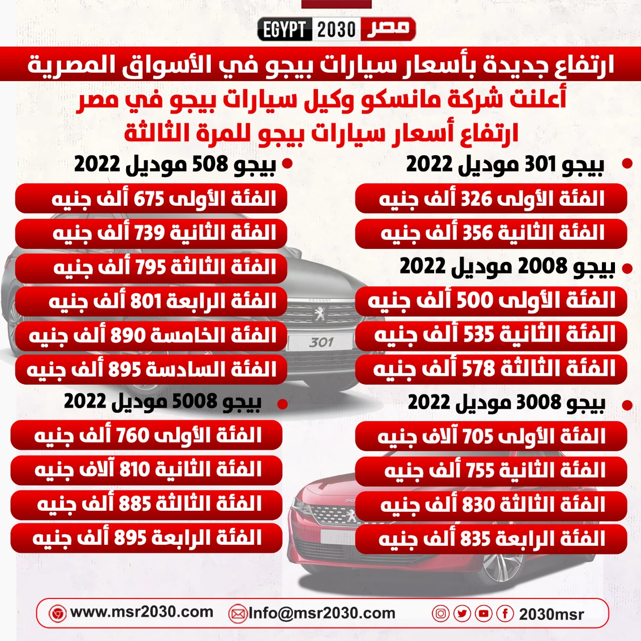 قالت شركة مانسكو للسيارات، وكيل سيارات بيجو في مصر، إن سعر سيارتها بيجو 301 موديل 2022 ارتفع على كل فئات السيارة بيجو 301.