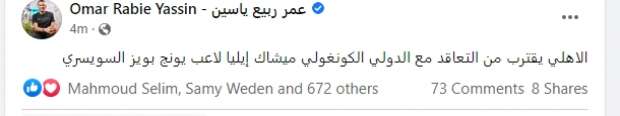 وكتب الإعلامي عمر ربيع ياسين عبر حسابه الرسمي على موقع التواصل الاجتماعي "فيسبوك": "الأهلي يقترب من التعاقد مع الدولي الكونغولي، ميشاك إيليا لاعب يونج بويز السويسري".