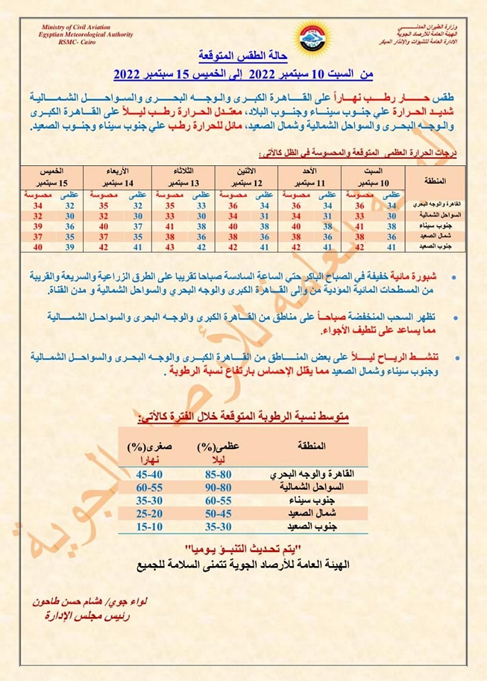 وبحسب بيان صادر عن الهيئة قبل قليل، جاءت حالة الطقس المتوقعة خلال الفترة من السبت 10 سبتمبر إلى الخميس 15 سبتمبر 2022 على كافة مدن وأنحاء الجمهورية كالتالي.