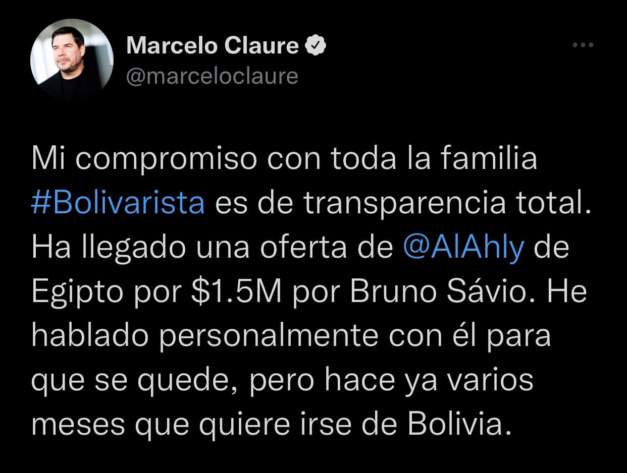وتابع: "جاء عرض من الأهلي من مصر مقابل 1.5 مليون دولار لبرونو سافيو، لقد تحدثت معه شخصيًا عن بقائه، لكنه كان يرغب في مغادرة بوليفيا لعدة أشهر حتى الآن".