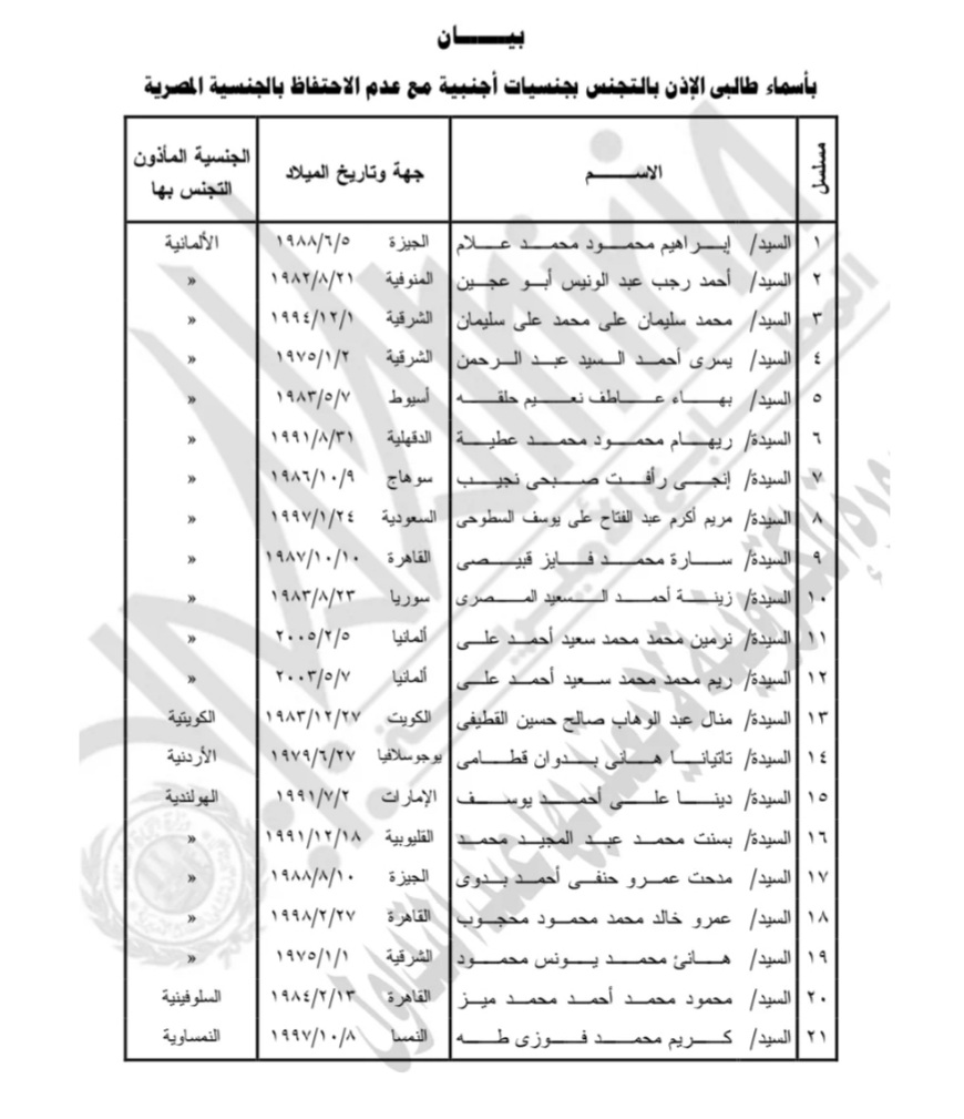 بالأسماء.. السماح لـ 21 شخصا بالتجنس بجنسيات أجنبية وسحب المصرية