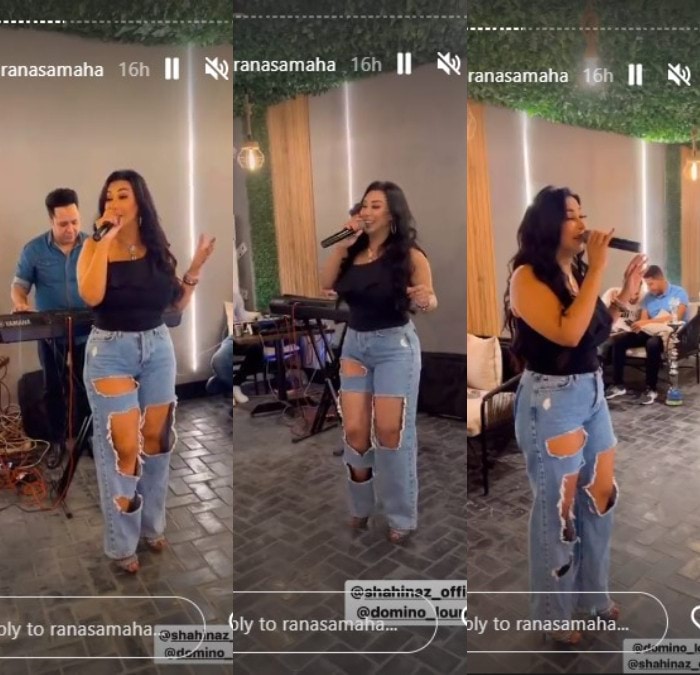 وظهرت شاهيناز، في الصورة بإطلالة جريئة ومثيرة، مرتدية توب أسود بكتف واحد مع بنطال جينز مقطع.