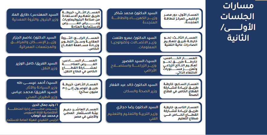 وتبدأ الجلسات الأولى والثانية لهذا اليوم تحت عنوان «خارطة طريق لتحديد الأولويات الاقتصادية القطاعية في برنامج عمل الحكومة للفترة المقبلة»، وتتبنى الحكومة المصرية عدد من المستهدفات على مستوى القطاعات الاقتصادية المختلفة، بهدف تعزيز مستويات مرونة الاقتصاد المصري وقدرته على مواجهة الصدمات الاقتصادية من خلال عدة مسارات وهي: «الكهرباء والبترول والاتصالات والإسكان والبيئة والنقل والزراعة والطيران والصناعة والسياحة».