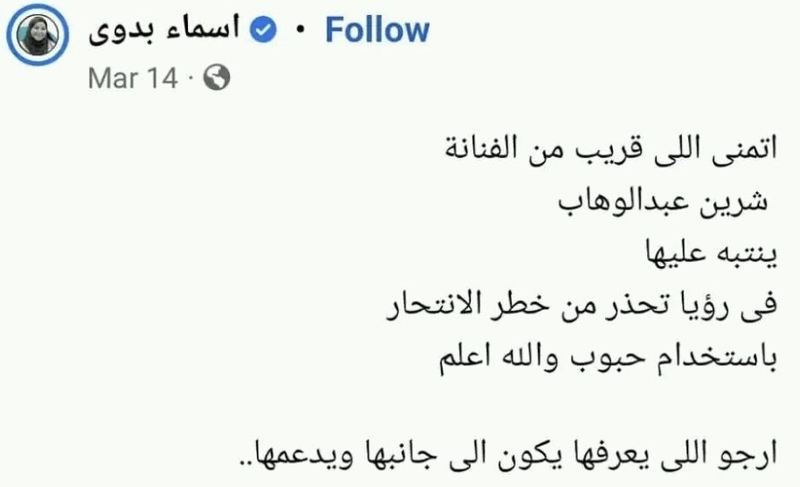 وجاء في منشور أسماء: "أتمنى اللي قريب من الفنانة شيرين عبد الوهاب ينبه عليها.. في رؤيا تحذر من خطر الانتحار باستخدام حبوب والله أعلم أرجو اللي يعرفها يكون جنبها ويدعمها".