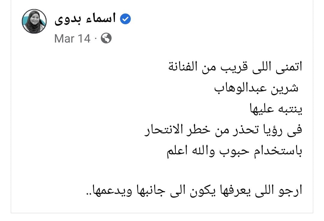 وجاء في المنشور: "اتمنى اللى قريب من الفنانة شرين عبدالوهاب ينتبه عليها فى رؤيا تحذر من خطر الانتحار باستخدام حبوب والله اعلم ارجو اللى يعرفها يكون الى جانبها ويدعمها".