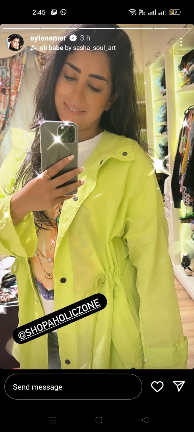 وظهرت آيتن عامر في الصورة، مرتدية جاكيت طويل باللون الأخضر، وتركت شعرها منسدل على كتفها .