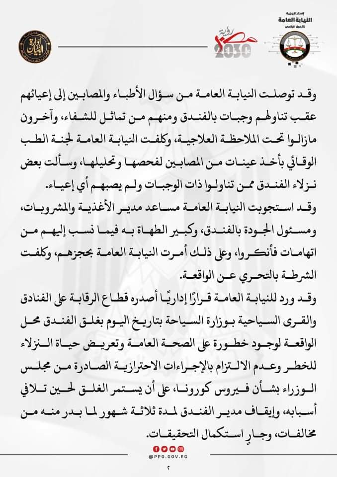وورد للنيابة العامة قرار إداري أصدره قطاع الرقابة على الفنادق والقرى السياحية بوزارة السياحة بتاريخ اليوم بغلق الفندق محل الواقعة؛ لوجود خطورة على الصحة العامة وتعريض حياة النزلاء للخطر، وعدم الالتزام بالإجراءات الاحترازية الصادرة من مجلس الوزراء بشأن فيروس كورونا على أن يستمر الغلق لحين تلافي أسبابه، وإيقاف مدير الفندق لمدة 3 أشهر لما بدر منه من مخالفات، وجارٍ استكمال التحقيقات.