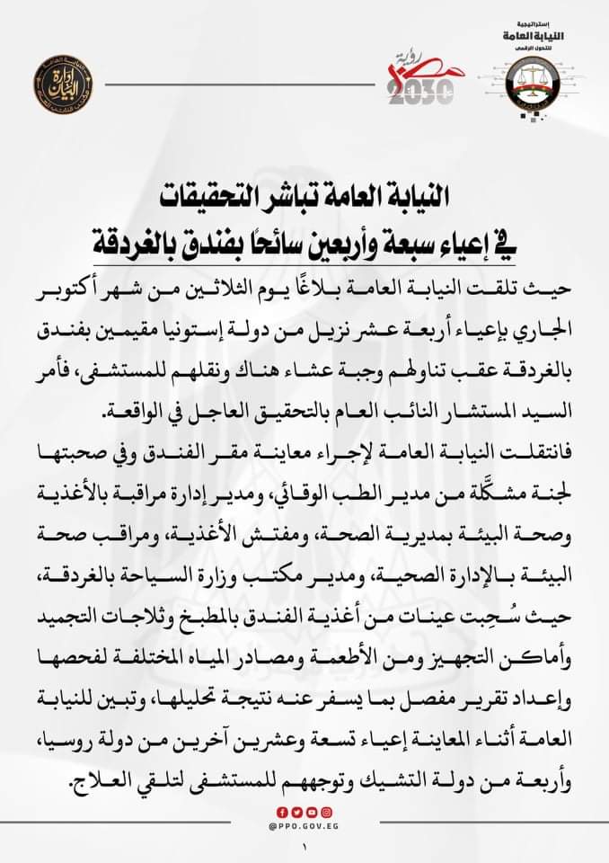 كشفت النيابة العامة تفاصيل التحقيقات في واقعة إعياء 14 نزيلًا أمس، من دولة إستونيا مقيمين بفندق بالغردقة عقب تناولهم وجبة عشاء هناك ونقلهم للمستشفى؛ فأمر المستشار حمادة الصاوي النائب العام بالتحقيق العاجل في الواقعة.