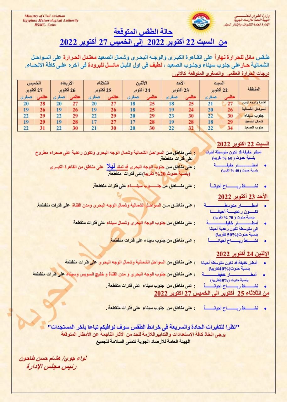 كشفت الهيئة العامة للأرصاد الجوية، عن توقعاتها بشأن حالة الطقس المتوقعة خلال الفترة من السبت 22 أكتوبر وحتى الخميس 27 أكتوبر 2022 على كافة مدن وأنحاء الجمهورية.