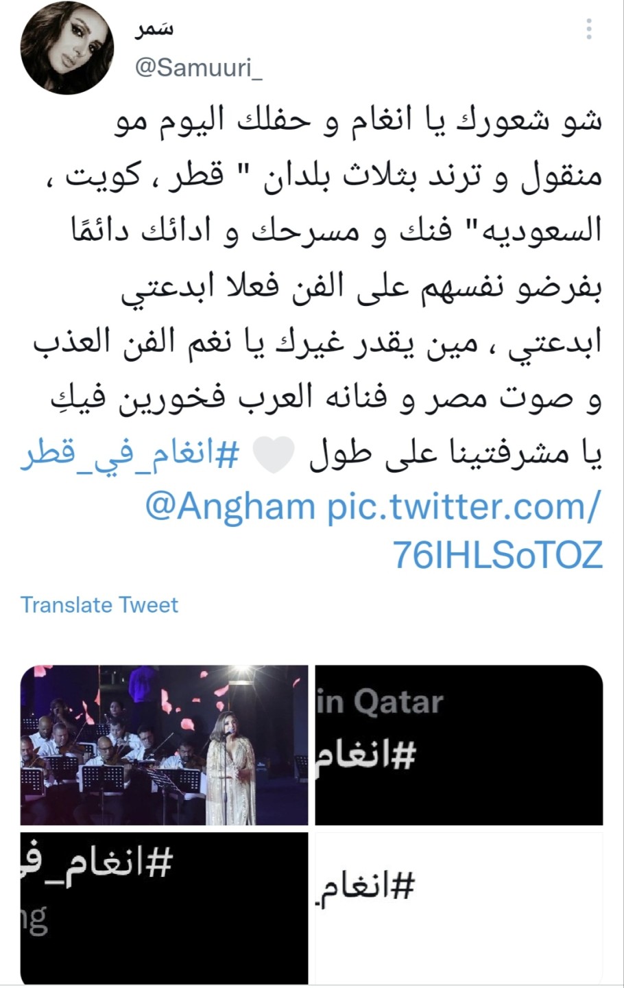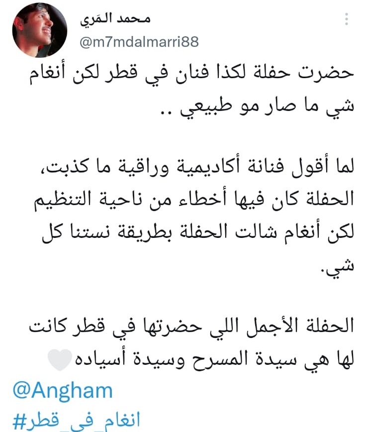 وجاء في تعليق آخر: «حضرت حفلة لكذا فنان في قطر لكن أنغام شي ما صار مو طبيعي ..لما أقول فنانة أكاديمية وراقية ما كذبت، الحفلة كان فيها أخطاء من ناحية التنظيم لكن أنغام شالت الحفلة بطريقة نستنا كل شي.الحفلة الأجمل اللي حضرتها في قطر كانت لها هي سيدة المسرح وسيدة أسياده».