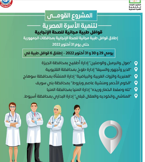 وأكدت وزارة الصحة والسكان، إنه تقرر إطلاق ٦ قوافل من يوم ٢٩ إلى ٣١ أكتوبر ٢٠٢٢، حيث الحملة تستهدف:-