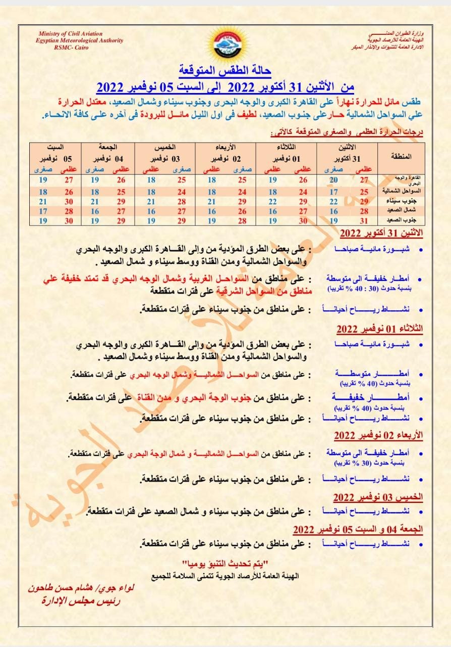 أصدرت الهيئة العامة للأرصاد الجوية، بيانًا بشأن حالة الطقس خلال الفترة من الاثنين 31 أكتوبر إلى السبت 5 نوفمبر 2022 على كافة مدن وأنحاء الجمهورية.