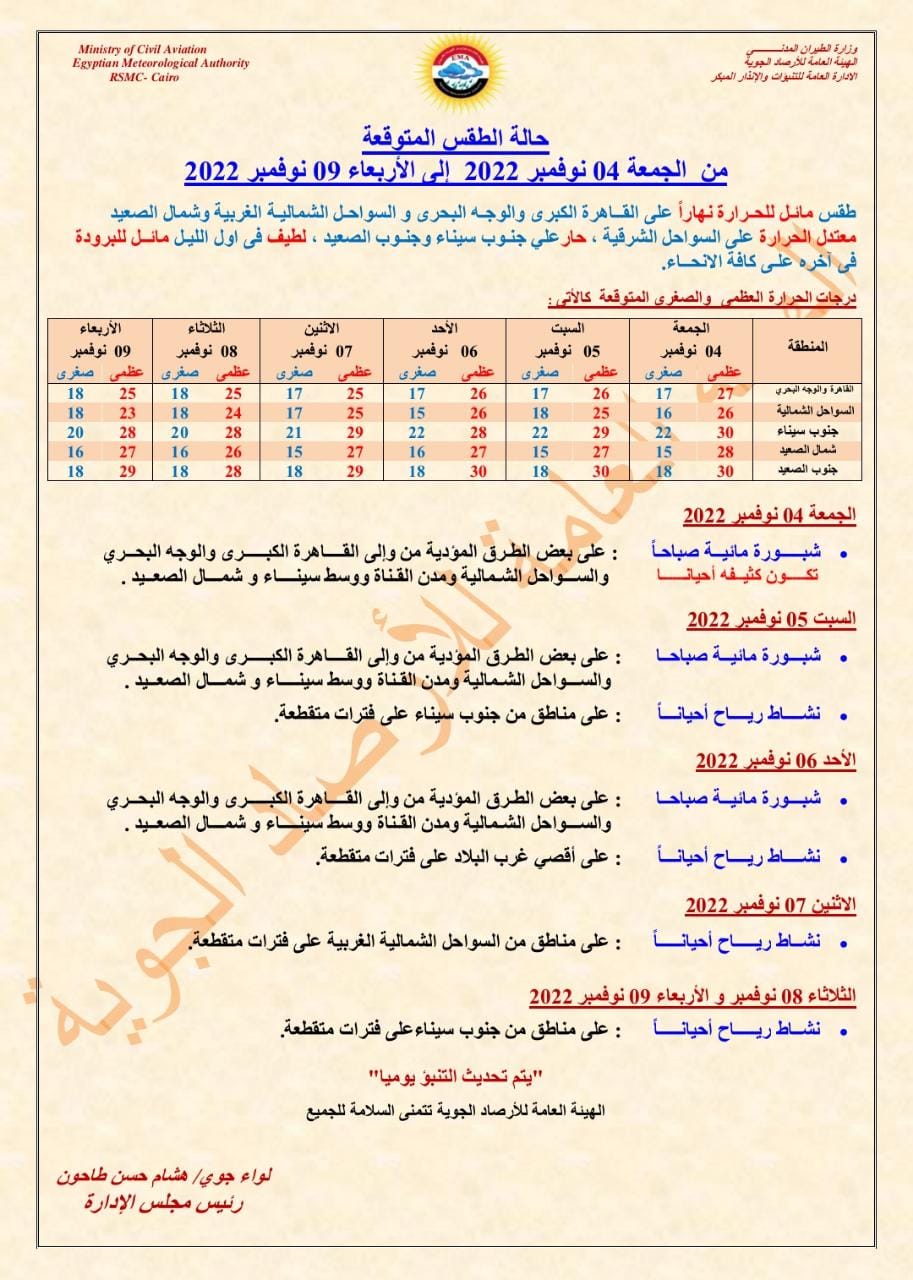كشفت الهيئة العامة للأرصاد الجوية، عن توقعاتها بشأن حالة الطقس المتوقعة خلال الفترة من الجمعة 4 نوفمبر وحتى الأربعاء 9 نوفمبر على كافة مدن وأنحاء الجمهورية.