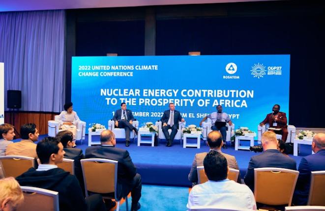 وكان الحدث الرئيسي في برنامج روساتوم في إطار فعاليات «كوب-27» هو «يوم الطاقة» المنعقد في 15 نوفمبر، حيث أقيمت على هامش المؤتمر فعالية نظمتها الشركة بعنوان «مساهمة الطاقة النووية في ازدهار إفريقيا»، وحضرها كل من كريل كوماروف النائب الأول للمدير العام – مدير قسم التنمية والأعمال الدولية، والدكتور أمجد الوكيل رئيس هيئة المحطات النووية لتوليد الكهرباء في مصر (NPPA) ، ويوسف أمينو أحمد الرئيس والمدير التنفيذي للجنة الطاقة الذرية في نيجيريا (NAEC) ، وروبرت سوغباجي مدير إدارة الطاقة المتجددة والنووية بوزارة الطاقة في غانا، ونوكس مزيبينزي المدير الإداري لجمعية الطاقة الذرية في جنوب إفريقيا، فيما تولدة إدارة نقاشات الجلسة السيدة برينسي متومبيني الناشطة الإفريقية المعروفة في مجال الطاقة النووية ومؤسسة منظمة Africa4Nuclear (جنوب إفريقيا).