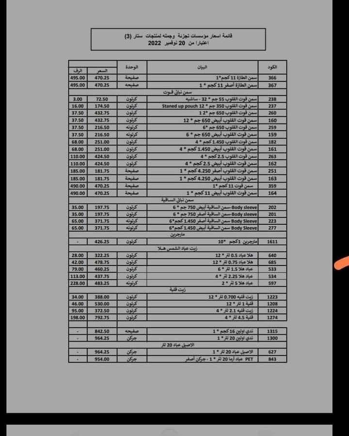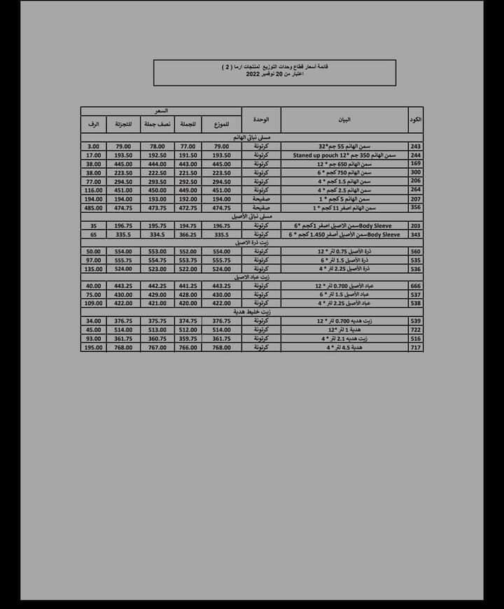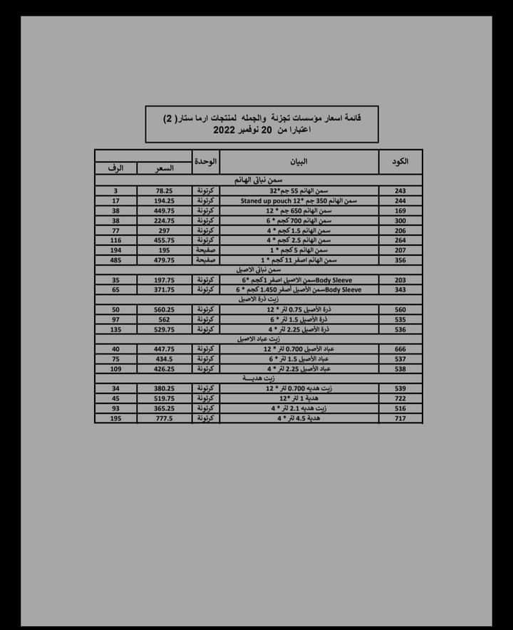 أعلنت مؤسسات تجزئة وجملة أرما ستار عن ارتفاع أسعار سمن الهانم وزيت الأصيل وهدية اعتبارًا من أمس 20 نوفمبر 2022.