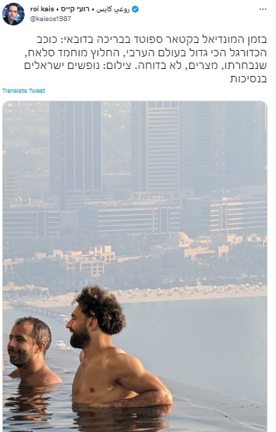 وقال الصحفي الإسرائيلي عبر تويتر: خلال مونديال قطر شوهد في مسبح في دبي أكبر نجم كرة قدم في الوطن العربي المهاجم محمد صلاح، مع المصطافين الإسرائيليين في الإمارة.