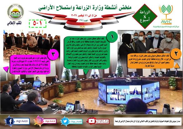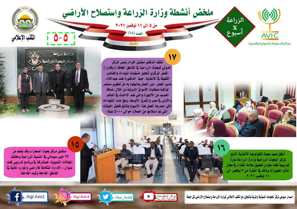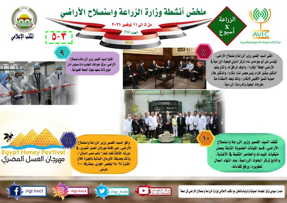 كشف مركز المعلومات الصوتية والمرئية، التابع لوزارة الزراعة واستصلاح الأراضي، عن مجموعة من الإنفوجرافات لأهم أنشطة الوزارة خلال الأسبوع الماضي، وهي الفترة من 5 إلى 11 نوفمبر الجاري، وذلك من خلال نسخة «الانفوجراف الأسبوعي» رقم 64، بالإضافة إلى ملخص بالفيديو، حول إنجازات الوزارة خلال نفس الفترة.