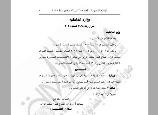 وجاء في الجريدة الرسمية أنه بعد الاطلاع على الدستور وعلى القانون القرار رقم 1995 لسنة 2021 الصادر بشأن الجنسية المصرية، وتفويض اللواء مساعد الوزير لقطاع شئون مكتب الوزير في مباشرة الاختصاص المقررة لوزير الداخلية بموجب القانون رقم 26 بشأن الجنسية المصرية؛ تم رد الجنسية المصرية لـ14 شخصًا.