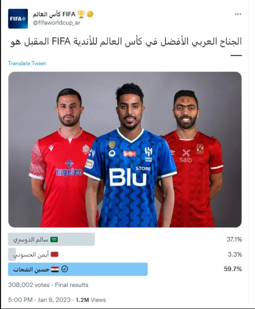 تفوق حسين الشحات، نجم النادي الأهلي، على منافسيه سالم الدوسري، لاعب فريق الهلال السعودي، وأيمن الحسوني، لاعب الوداد المغربي، في استفتاء الاتحاد الدولي لكرة القدم “فيفا”، لأفضل "جناح" ضمن صفوف الفرق العربية التي ستشارك في النسخة المقبلة من بطولة كأس العالم للأندية.