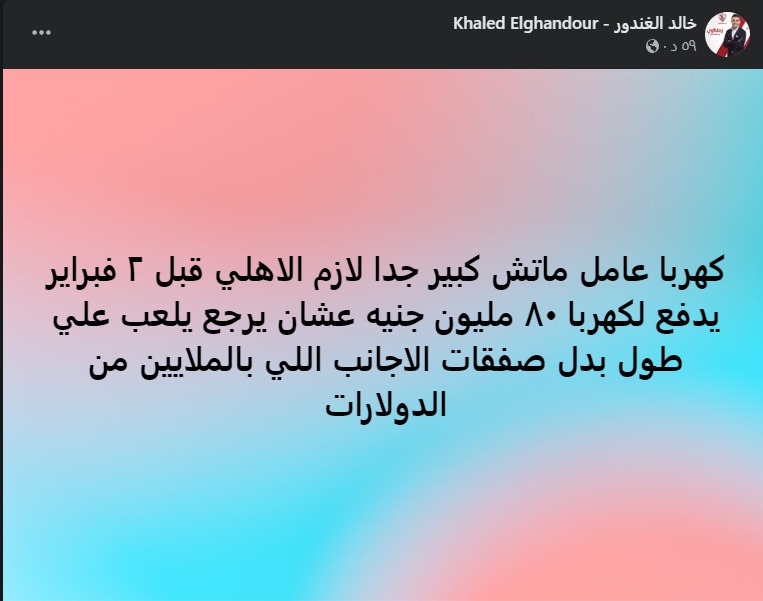 وكتب خالد الغندور عبر صفحته الشخصية على فيس بوك: "كهربا عامل ماتش كبير جدا لازم الأهلي قبل 2 فبراير يدفع لكهربا 80 مليون جنيه عشان يرجع يلعب على طول بدل صفقات الأجانب اللي بالملايين من الدولارات".