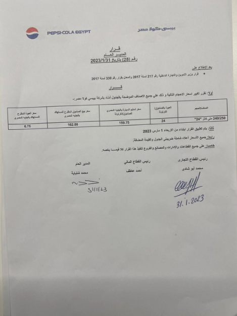 وبحسب المستند من شركة بيبسي، رفعت الشركة سعر بيع الصندوق البيبسي كانز 250/240 مل إلى 162 جنيها.