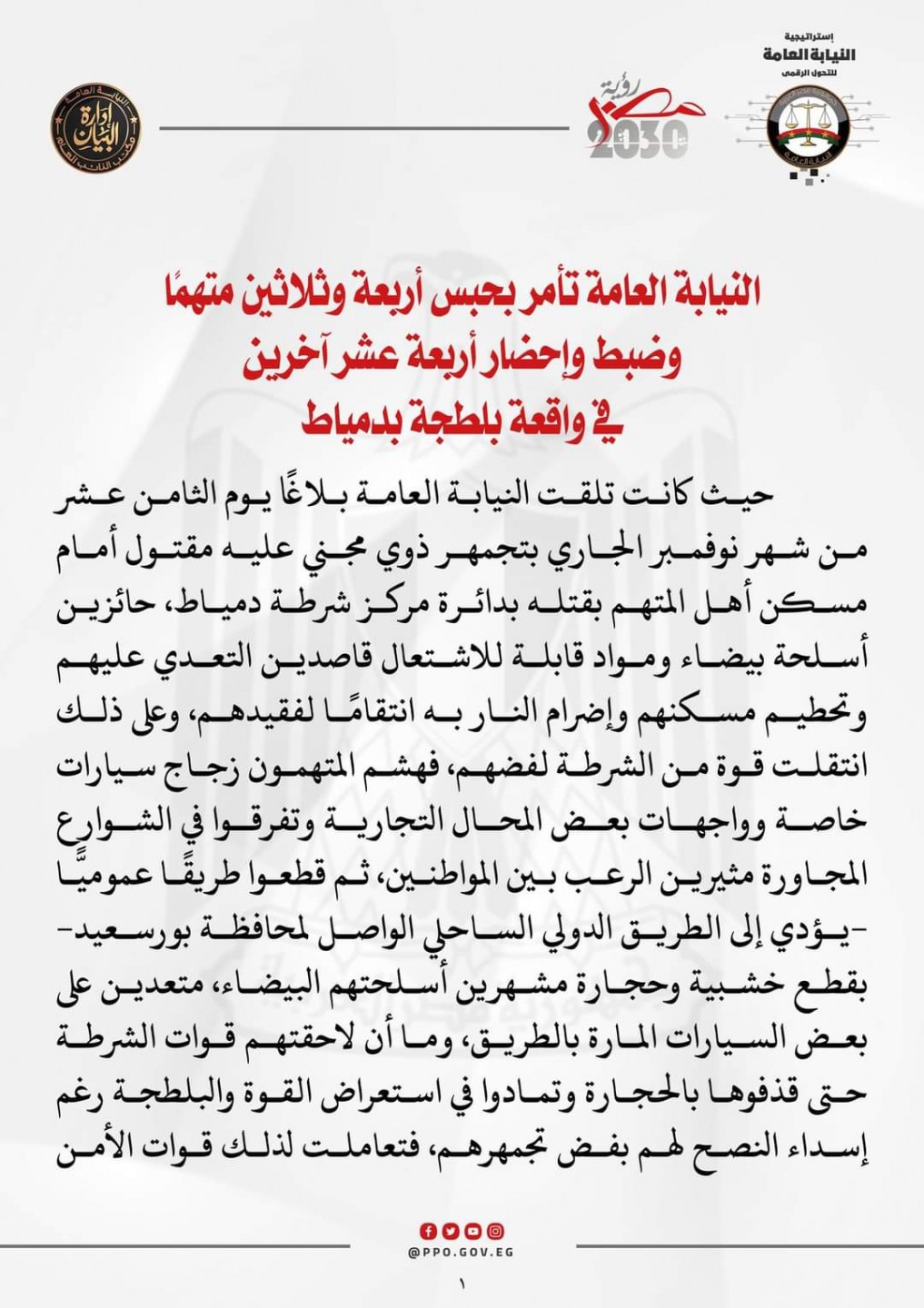 النيابة العامة تأمر بحبس 34 متهمًا.. وضبط وإحضار 14 آخرين في واقعة بلطجة بدمياط