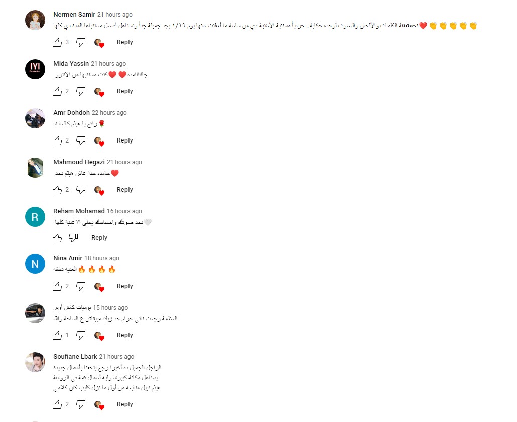 أغنية أيامي للنجم هيثم نبيل لاقت الكثير من التعليقات الإيجابية من قبل الجمهور، وجاءت بعض التعليقات كالتالي: