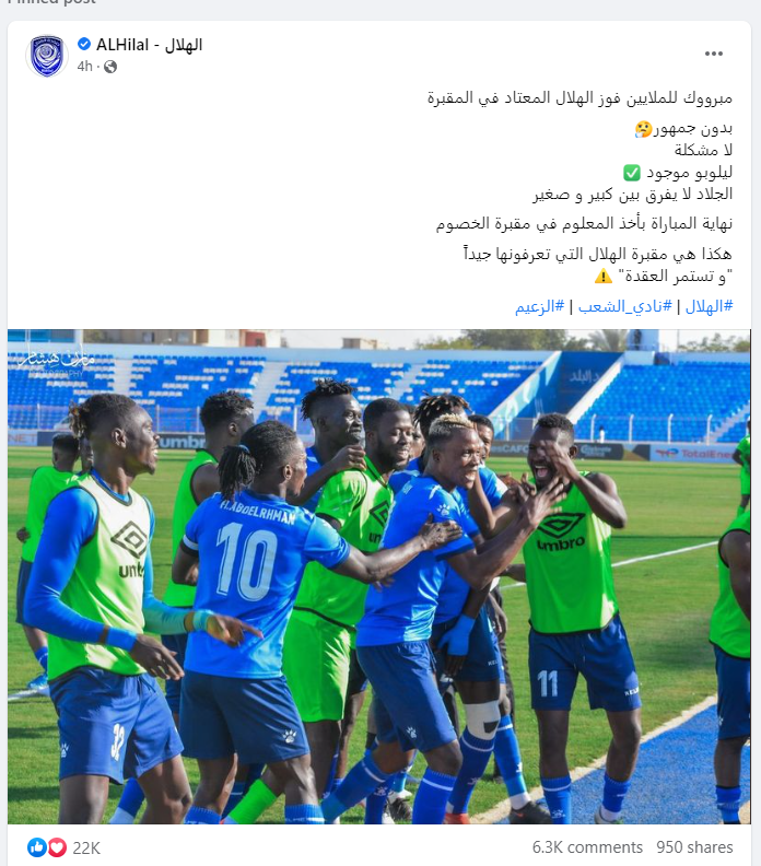 وكتب الحساب الرسمي على موقع التواصل الاجتماعي "فيسبوك": "مبرووك للملايين فوز الهلال المعتاد في المقبرة".