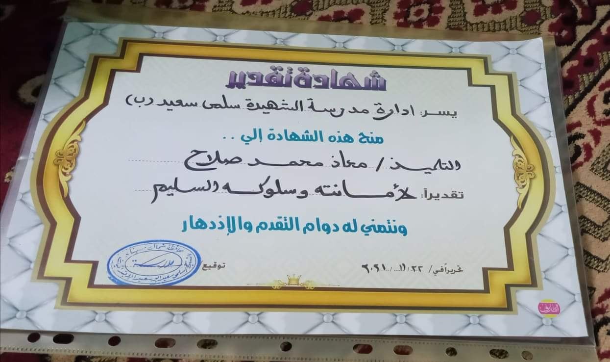 وقامت مديرة المدرسة بتسليم المحفظة لصاحبتها، وهي مدرسة لغة إنجليزية بالمدرسة نفسها، وقامت إدارة مدرسة الشهيدة سلمى سعيد الابتدائية بمحافظة شمال سيناء بتكريم الطفل وإعطائه مبلغًا ماليًّا وشهادة تقدير، وقامت المدرسات بتقديم الهدية الرمزية للطفل.