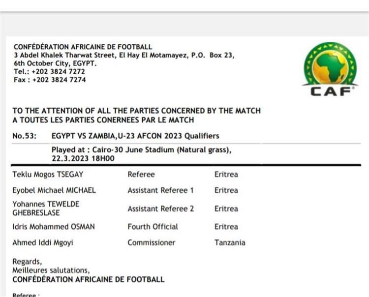 أعلن الاتحاد الإفريقي لكرة القدم "كاف" عن طاقم تحكيم مباراة مصر وزامبيا في المرحلة النهائية للتصفيات الإفريقية المؤهلة لكأس الأمم تحت 23 عام.