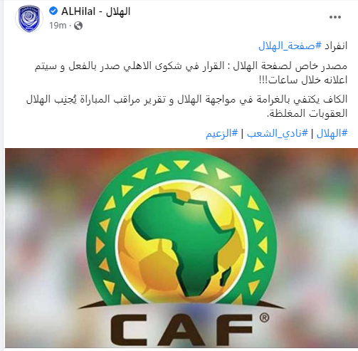 ووفقًا للحساب الرسمي للهلال السوداني على موقع التواصل الاجتماعي "فيسبوك"، فإن القرار الخاص في شكوى الأهلي ضد الهلال صدر بالفعل، وسيتم إعلانه خلال ساعات.