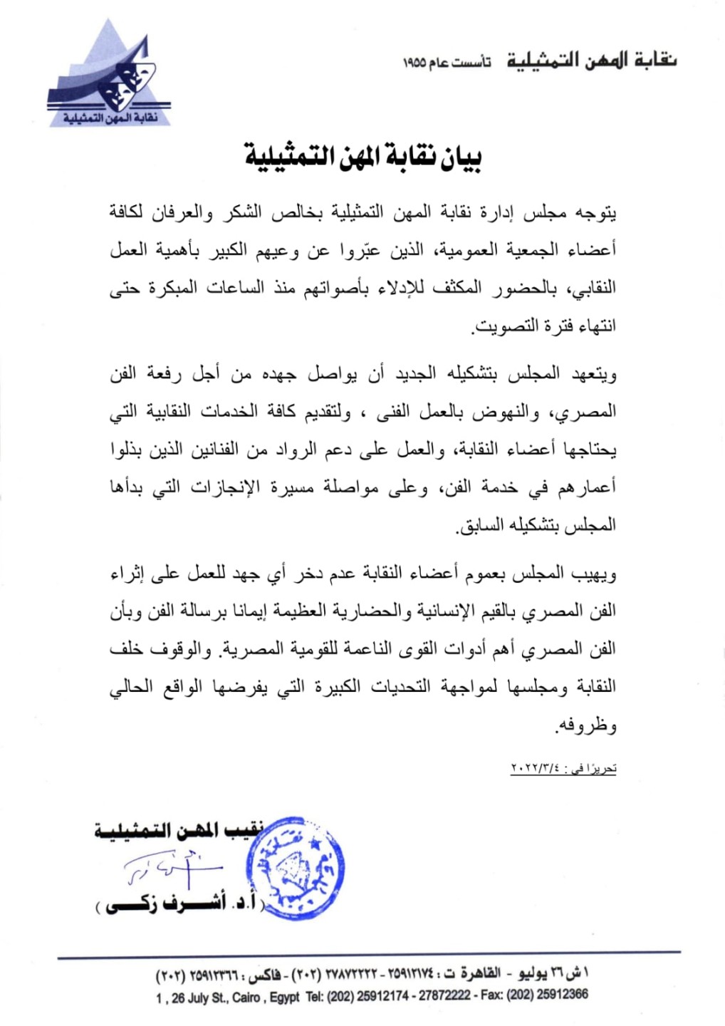 وتابع أشرف زكي في البيان الذي نشره أنه يتعهد هو ومجلسه الجديد بمواصلة جهودهم من أجل رفعة الفن المصري، ودعم الفنانين الشباب.