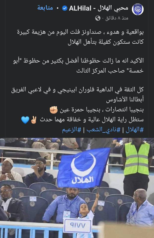 واختتم: "كل الثقة في الداهية فلوران إبينيجي، وفي لاعبي الفريق أبطالنا الأشاوس، بنجيبا انتصارات، بنجيبا حمرة عين، وستظل راية الهلال عالية وخفاقة مهما حدث".