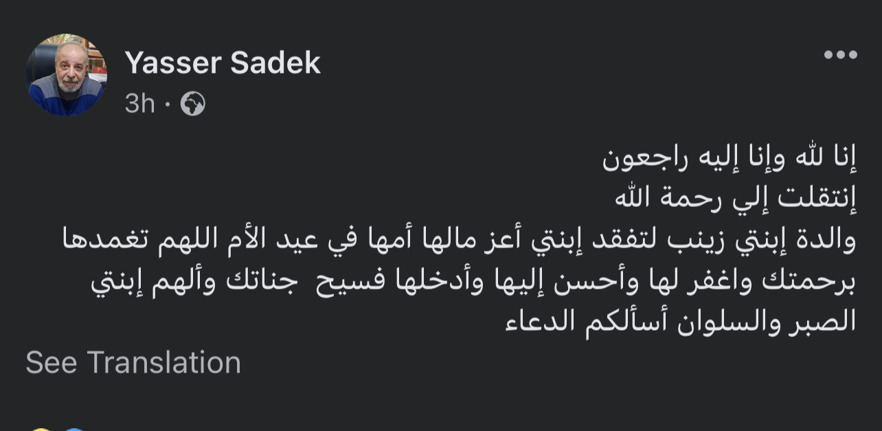 وكتب ياسر صادق، قائلاً: "إنا لله وإنا إليه راجعون.. انتقلت إلى رحمة الله.. والدة ابنتي زينب، لتفقد ابنتي أعز مالها أمها في عيد الأم.. اللهم تغمدها برحمتك واغفر لها وأحسن إليها وأدخلها فسيح جناتك وألهم ابنتي الصبر والسلوان أسألكم الدعاء".