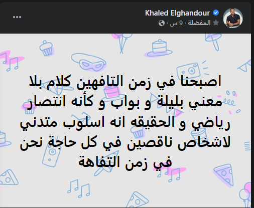 ومن جانبه رد الغندور عبر صفحته الرسمية بموقع التواصل الاجتماعي “فيس بوك”: “أصبحنا في زمن التافهين كلام بلا معني، بليلة، وبواب، وكأنه انتصار رياضي”.
