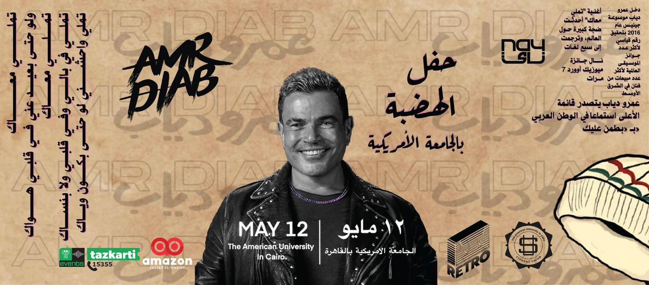 يستعد النجم عمرو دياب، لإحيائه حفلا غنائيا كبيرا، يوم الجمعة الموافق 12 مايو بالجامعة الأمريكية.