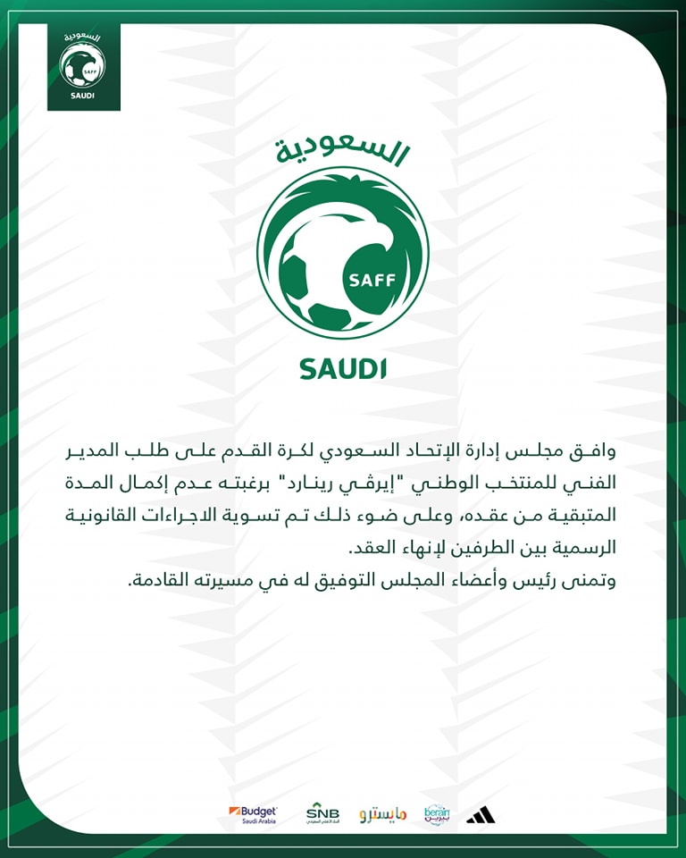 وأصدر اتحاد كرة القدم بيانًا اليوم الثلاثاء، قال فيه: "بناء على رغبة المدير الفني للمنتخب السعودي هيرفي رينارد في عدم إكمال المدة المتبقية من عقده مع المنتخب، تم تسوية الإجراءات القانوينة الرسمية بين الطرفين لإنهاء العقد".