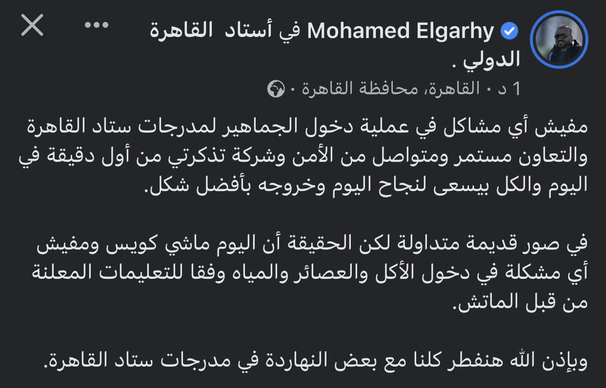 وكتب الجارحي عبر حسابه الرسمي على موقع التواصل الاجتماعي "فيسبوك": "مفيش أي مشاكل في عملية دخول الجماهير لمدرجات ستاد القاهرة".