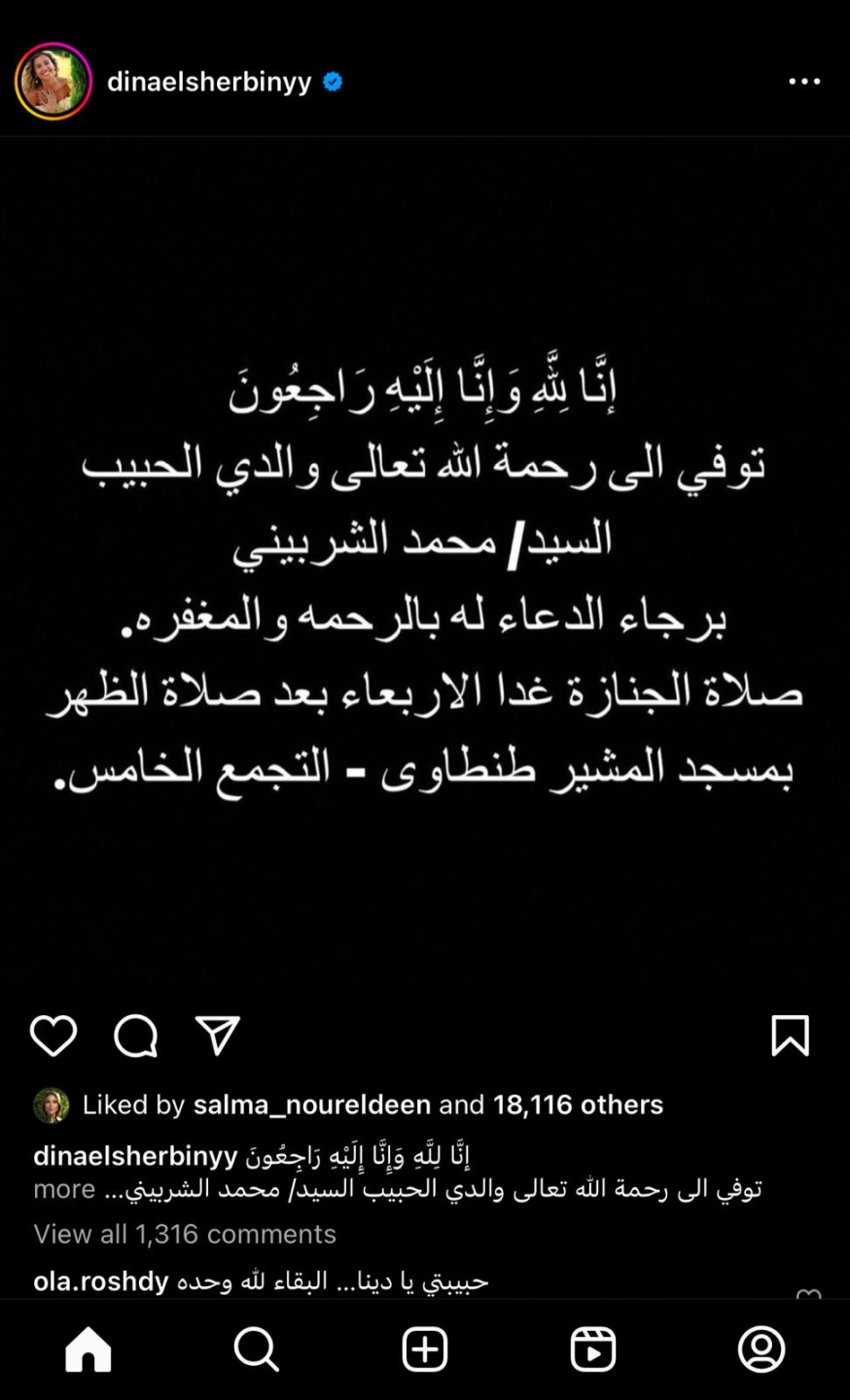 وكتبت دينا الشربيني عبر حسابها الشخصي على إنستجرام: "إنا لله وإنا اليه راجعون، توفي إلى رحمة الله تعالى والدي الحبيب السيد محمد الشربيني، وصلاة الجنازة اليوم الأربعاء".